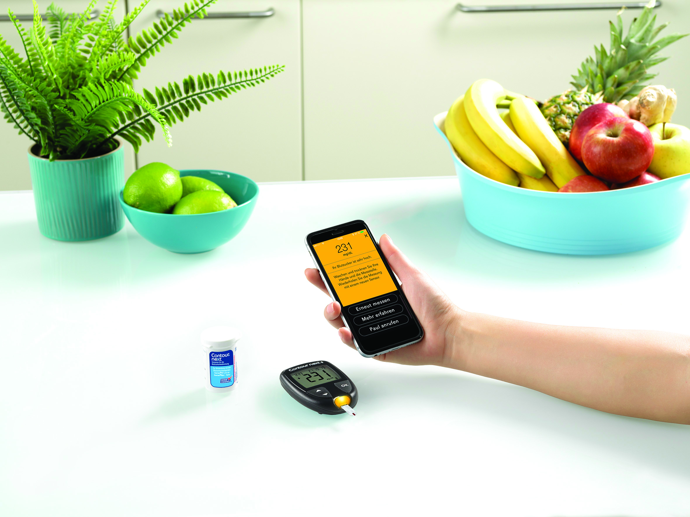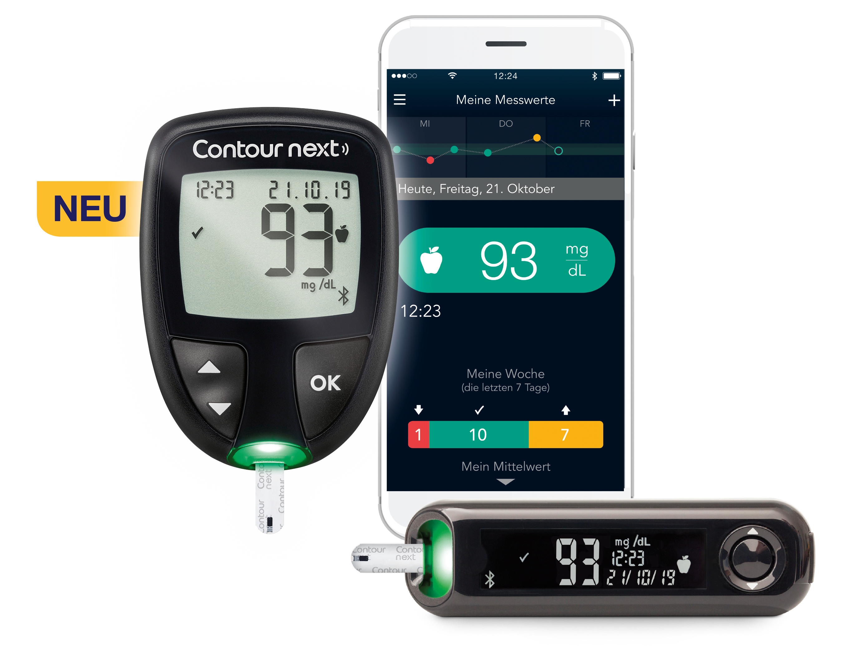 Eine ideale Ergänzung für das BZMS ist die kostenfreie Contour®Diabetes App. Einmal mit dem Smartphone verbunden, werden die gemessenen Blutzuckerwerte vom Blutzuckermessgerät automatisch in die App übertragen. Diese nutzt ebenfalls die leuchtenden Smartlight Farben und zeigt im Falle eines kritischen Messwerts (Unter- oder Überzuckerung) einen deutlichen Warnhinweis mit einer einfachen Handlungsempfehlung, um den Blutzucker wieder zu stabilisieren. Die Contour Diabetes App erkennt darüber hinaus wiederkehrende Muster und Trends im Blutzuckerverlauf. Wurde ein Muster erkannt, informiert die App darüber, erläutert mögliche Ursachen und gibt praktische Tipps für bessere Messwerte.