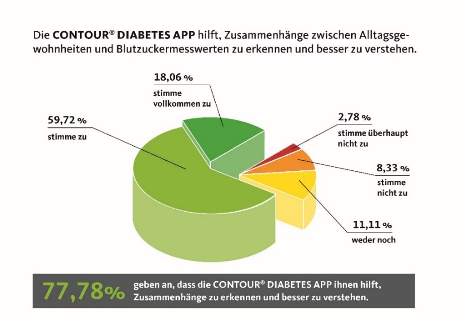 Die Contour® Diabetes App erkennt wiederkehrende Trends und Muster im Blutzuckerverlauf, macht den Anwender darauf aufmerksam und gibt motivierende Tipps, wie das Muster verbessert werden kann – die Funktion „Meine Muster“ schätzen 7 von 10 Testern und geben ein „gut“ oder „sehr gut“. Während der Testdauer wurde bei über der Hälfte der Tester ein Muster erkannt, darunter am häufigsten das Muster „nüchtern hoch“. Zwei von drei Testern geben an, dass die Mustererkennung ihnen sogar dabei hilft, Gewohnheiten zu erkennen, wenn nötig zu verändern und nachhaltig Fortschritte zu machen.