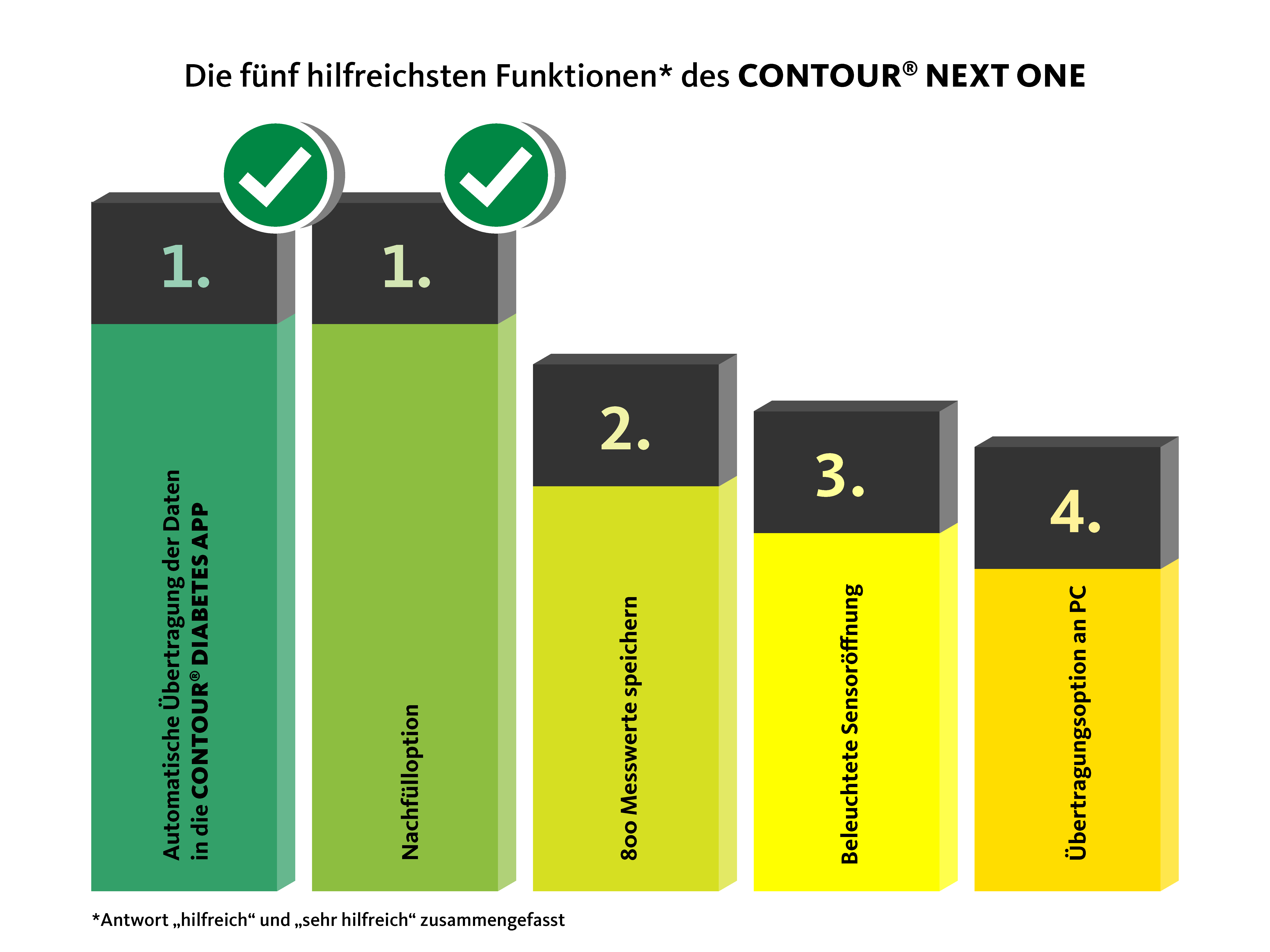 90 Prozent der Teilnehmer am Blood Sugar Lounge Produktcheck würden das Contour® Next One Blutzuckermessgerät anderen Patienten empfehlen! Das Contour® Next One Blutzuckermessgerät hat also überzeugt – ebenso die Contour® Diabetes App , die fast 80 Prozent der Tester weiterempfehlen würden. In vielen weiteren Bereichen wurden Messgerät und App gut oder sogar sehr gut bewertet. Das wichtigste Ergebnis der Fragebogenauswertung: Über 90 Prozent der Produkttester würden das Contour® Next One Messgerät anderen Diabetespatienten empfehlen. Ganz besonders hilfreich finden die Produkttester die automatische Übertragung der gemessenen Werte in die Contour® Diabetes App sowie die Nachfülloption, die es ermöglicht, innerhalb von 60 Sekunden erneut Blut auf den Teststreifen aufzutragen – beide Funktionen werden mit 94,44 Prozent als hilfreich oder sehr hilfreich bewertet und teilen sich Platz 1 im Ranking der hilfreichsten Funktionen. An zweiter Stelle steht die Möglichkeit 800 Messwerte zu speichern, an dritter Stelle die beleuchtete Sensoröffnung, mit der man auch im Dunkeln problemlos messen kann und zu guter Letzt die Übertragungsoption der Daten des Blutzuckermessgeräts an den PC.
